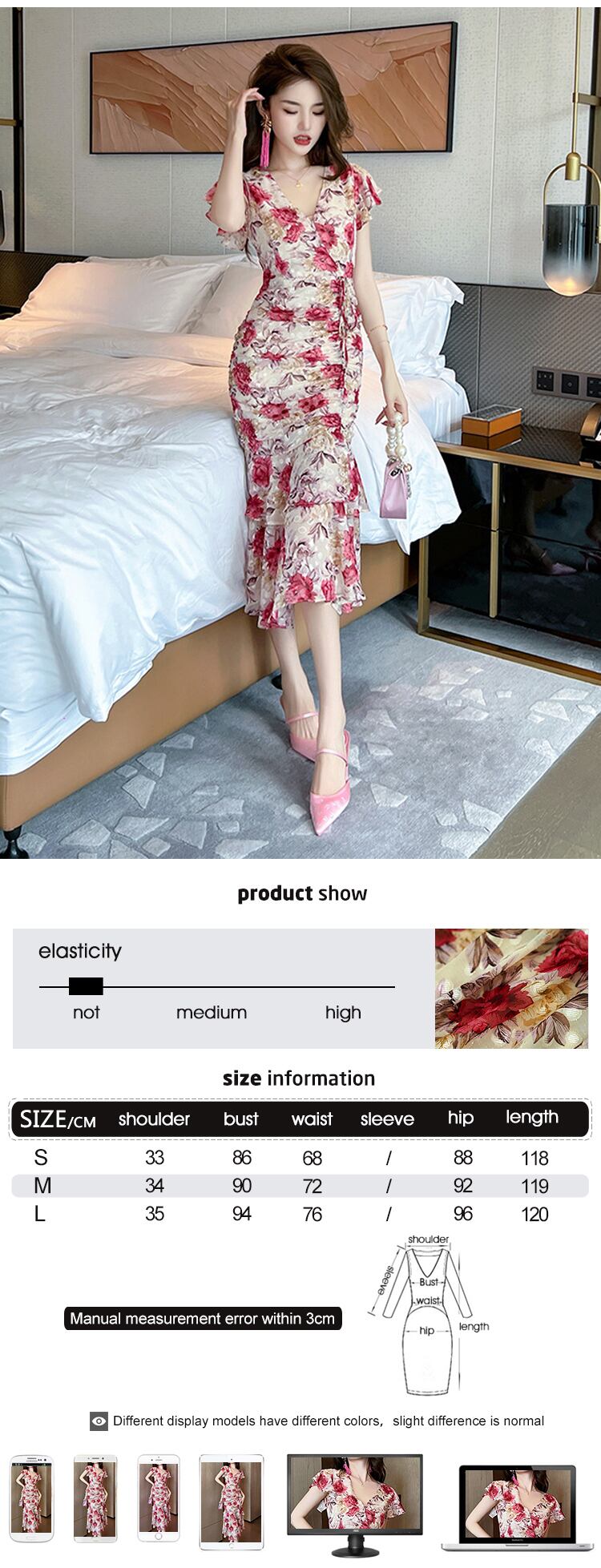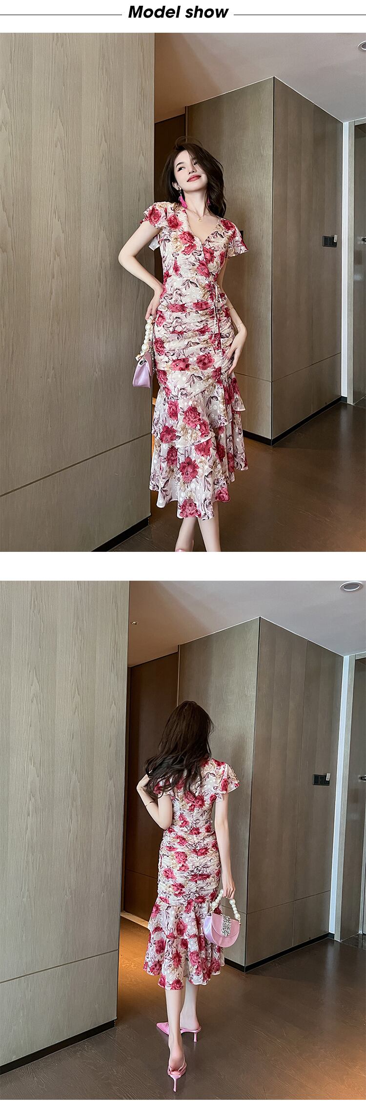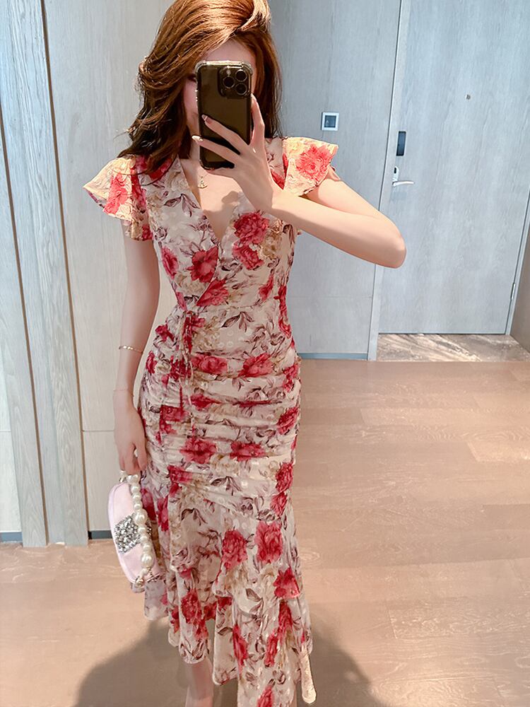 シフォン サマー 夏物 ドレス Vネック スリム ビンテージ MingJieBiHuo33013560126