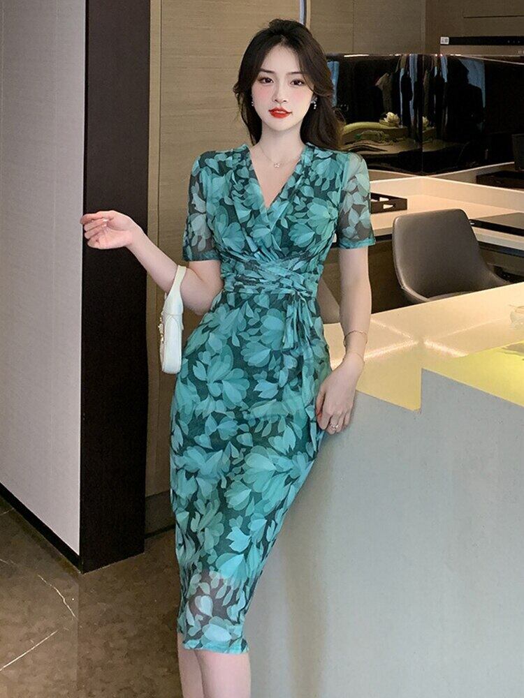 ストリート サマー 夏物 メッシュ ドレス 花柄 Vネック スリム ビンテージ MingJieBiHuo41554833788