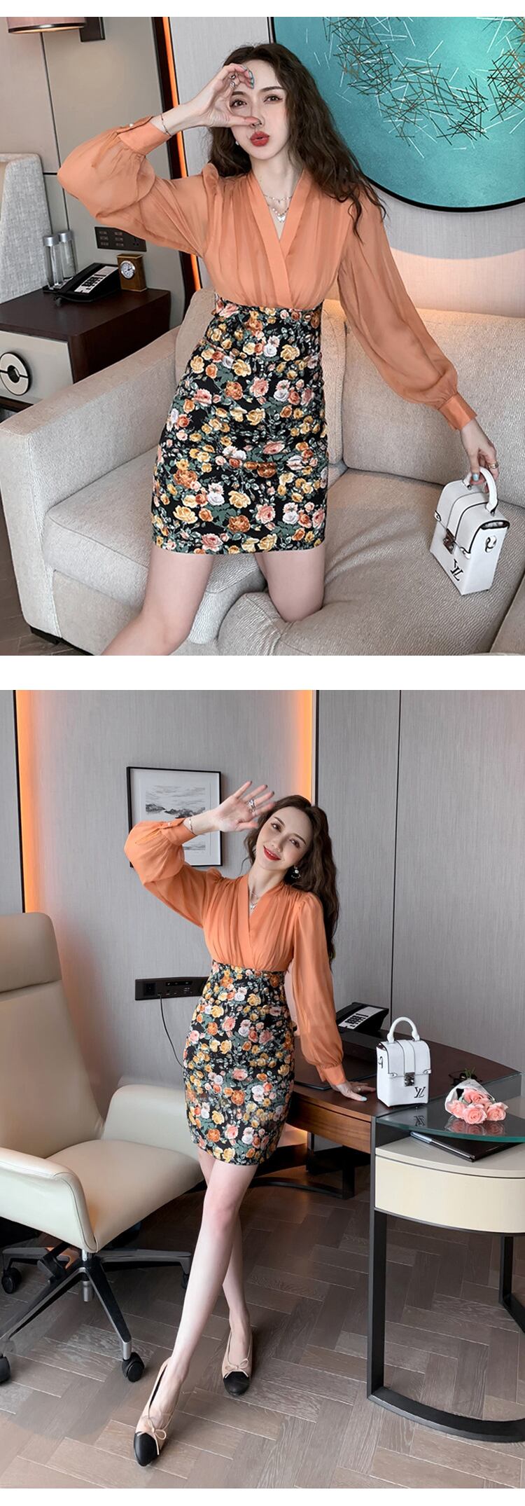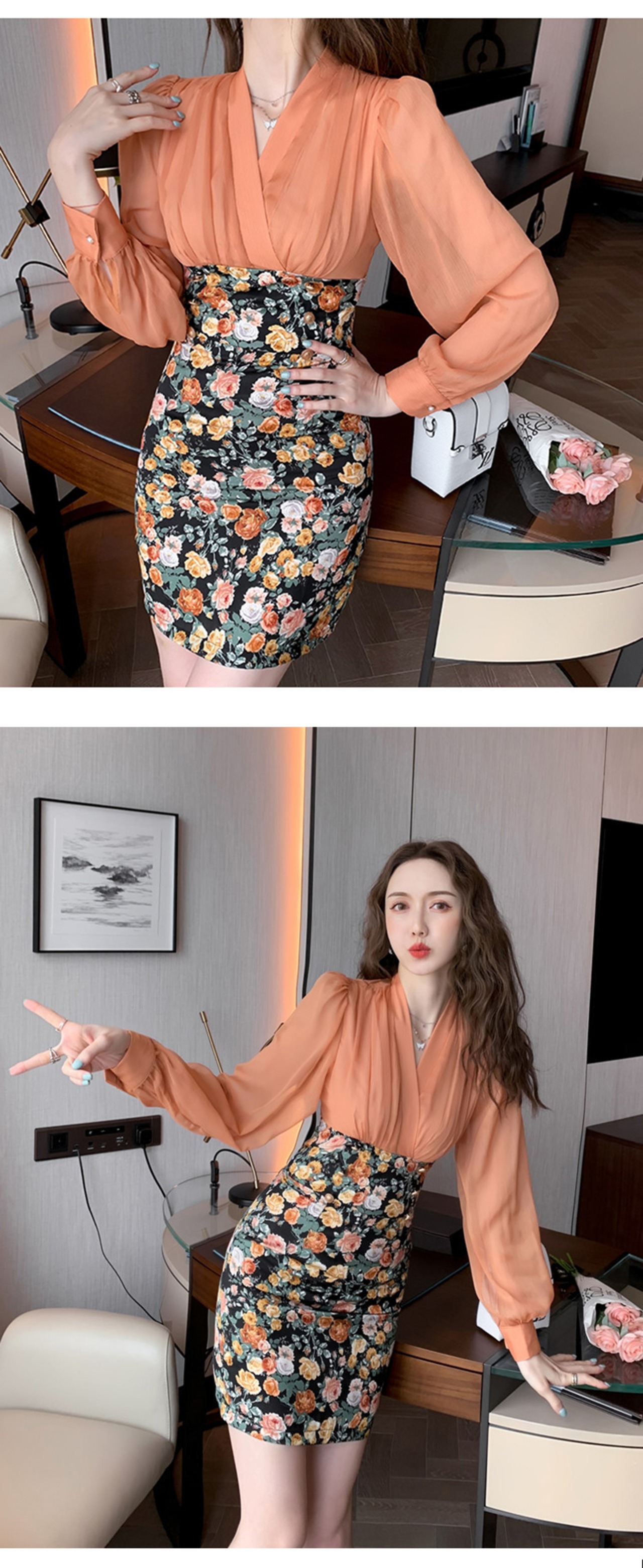 ロング ミニ シフォン 長袖 ストリート 花柄 Vネック ビンテージ MingJieBiHuo61586355673