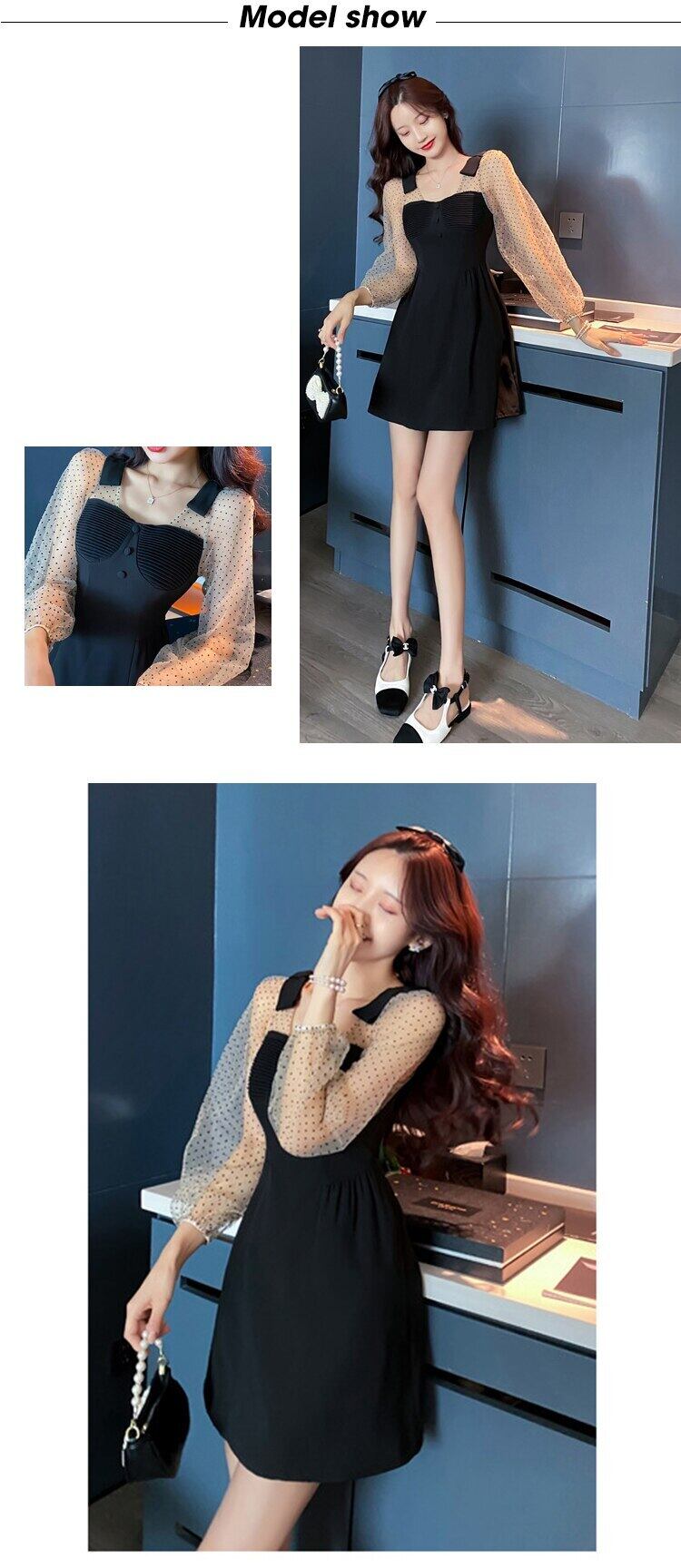 ミニ ブラック ランタンスリーブ 大人ガーリー スウィート キュート カジュアル メッシュ スクウェア ビンテージ MingJieBiHuo6594176630